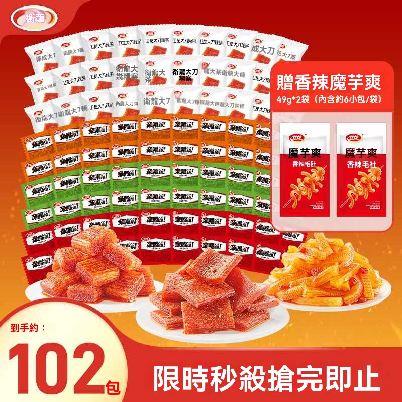 【衛龍辣條王國】102包經典組合・香辣味/親嘴燒/魔芋爽/大面筋一次集結・追劇熬夜必備的解壓神器!